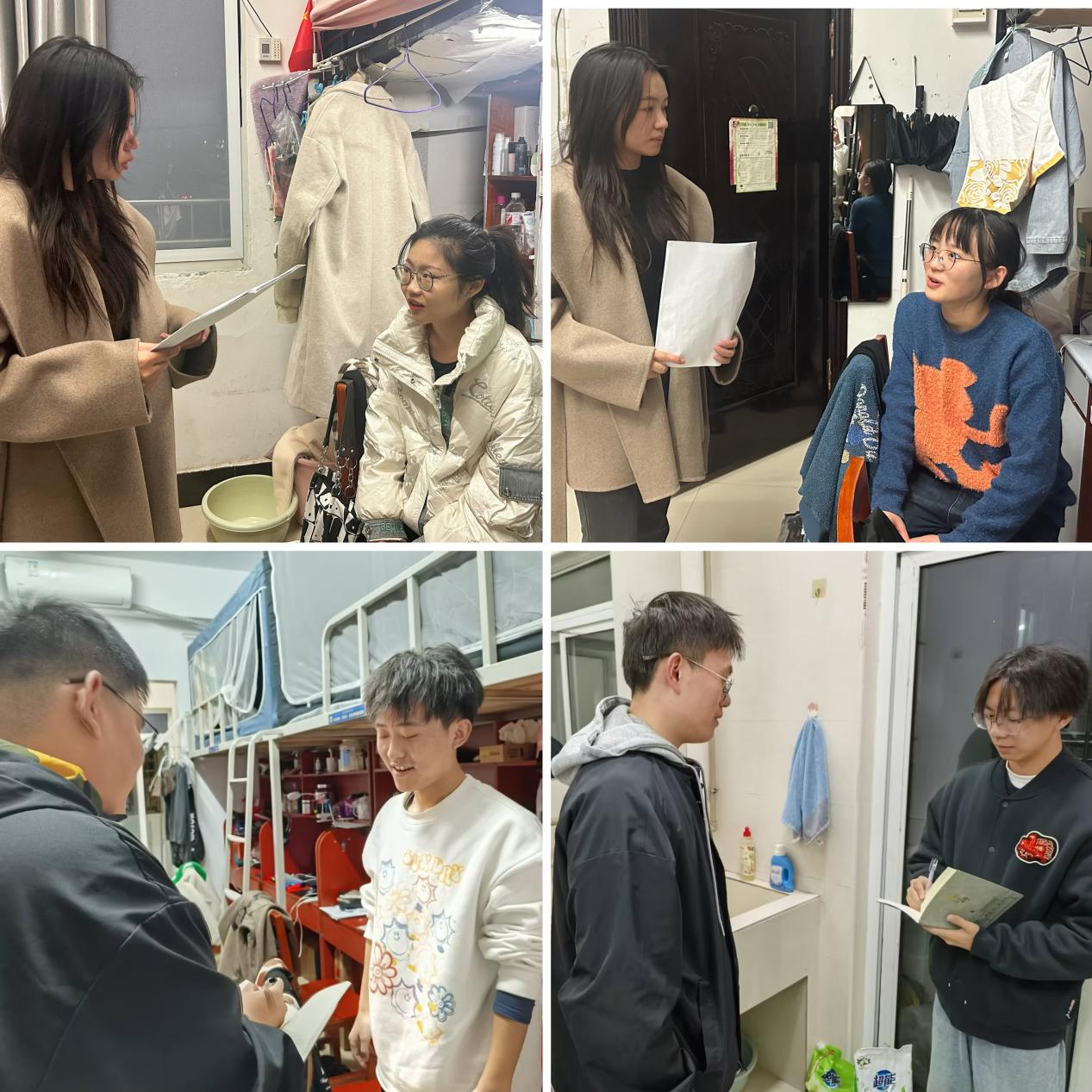 与此同时,辅导员老师们与院研究生会权益服务部成员走访学生寝室,深入了解同学们的日常生活状况与学业科研情况,仔细记录同学们的权益诉求。秋冬季节火灾隐患高发,老师提醒同学们务必严格遵守宿舍安全管理规定,禁止使用高功率违规电器,保持寝室整洁,消除潜在安全隐患。
